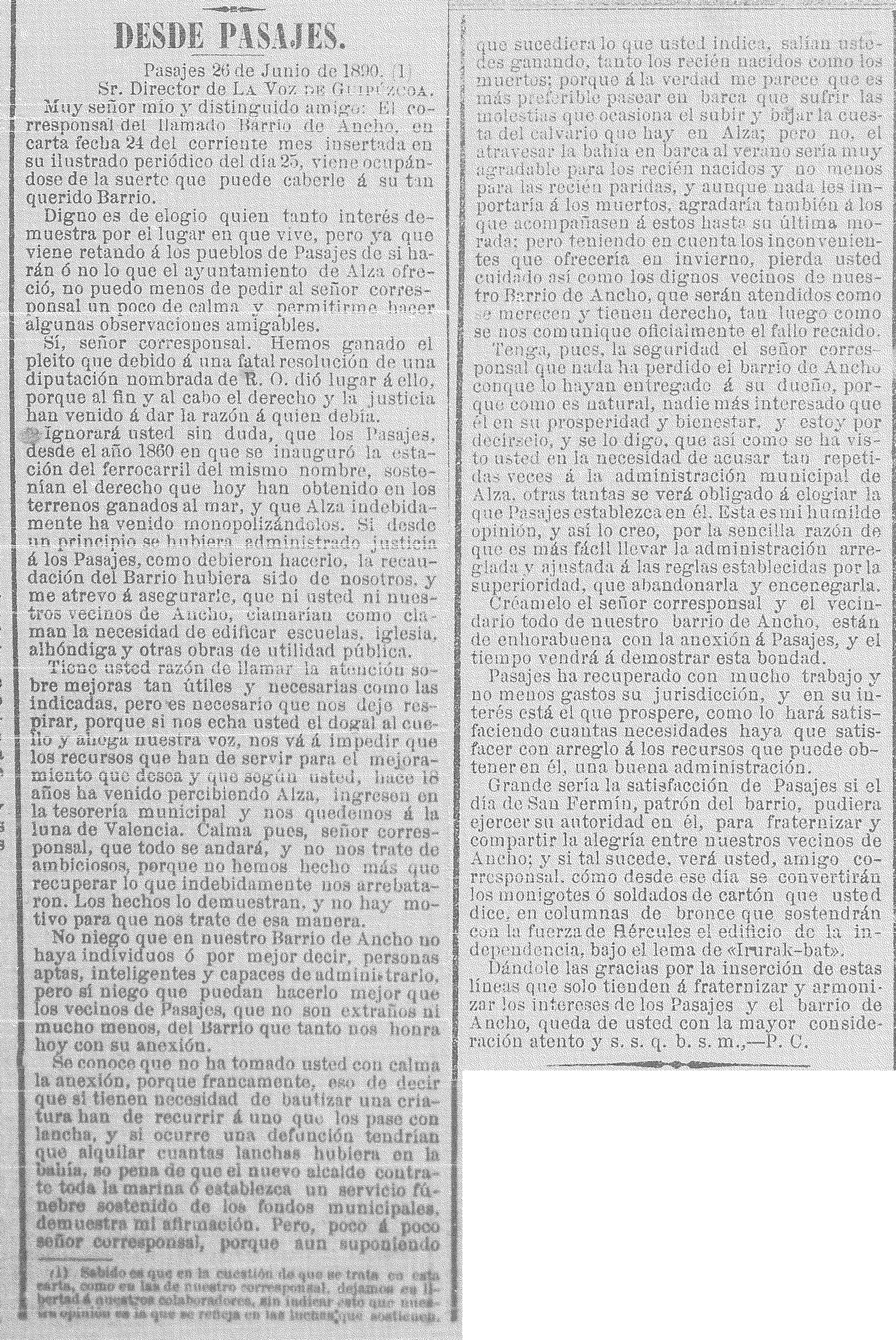 Ignorará usted sin duda que los Pasajes, desde el año 1860 en que se inauguró la estación de ferrocarril del mismo nombre, sostenían el derecho que hoy han obtenido en los terrenos ganados al mar, y que Alza ha venido indebidamente monopolizándolos. Si desde un principio se hubiera administrado justicia a los Pasajes como debieron hacerlo, la recaudación del barrio hubiera sido de nosotros, y me atrevo a asegurarle, que ni usted ni nuestros vecinos de Ancho clamarían como claman la necesidad de edificar escuelas, iglesia, alhóndiga y otras obras de utilidad pública.