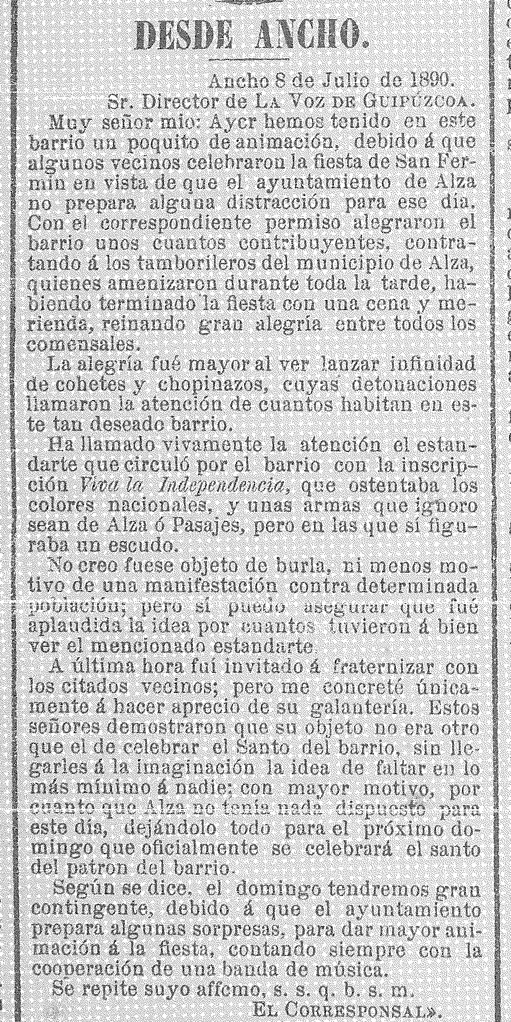 Ayer hemos tenido en este barrio un poquito de animación, debido a que algunos vecinos celebraron la fiesta de San Fermín, en vista de que el ayuntamiento de Alza no prepara alguna distracción para ese día. Con el correspondiente permiso, alegraron el barrio unos cuantos contribuyentes, contratando a los tamborileros del municipio de Alza, quienes amenizaron durante toda la tarde, habiendo terminando la fiesta con una cena y merienda, reinando gran alegría entre todos los comensales.