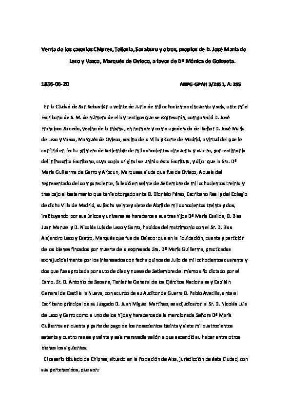 | Ezaugarriak: | Transkripzioa: Chipres, Telleria, Soraburu eta beste batzuk, José María de Lezo eta Vasco jaunenak, Oviecoko markesak, Goizuetako Monica andrearen alde egindako salmenta |