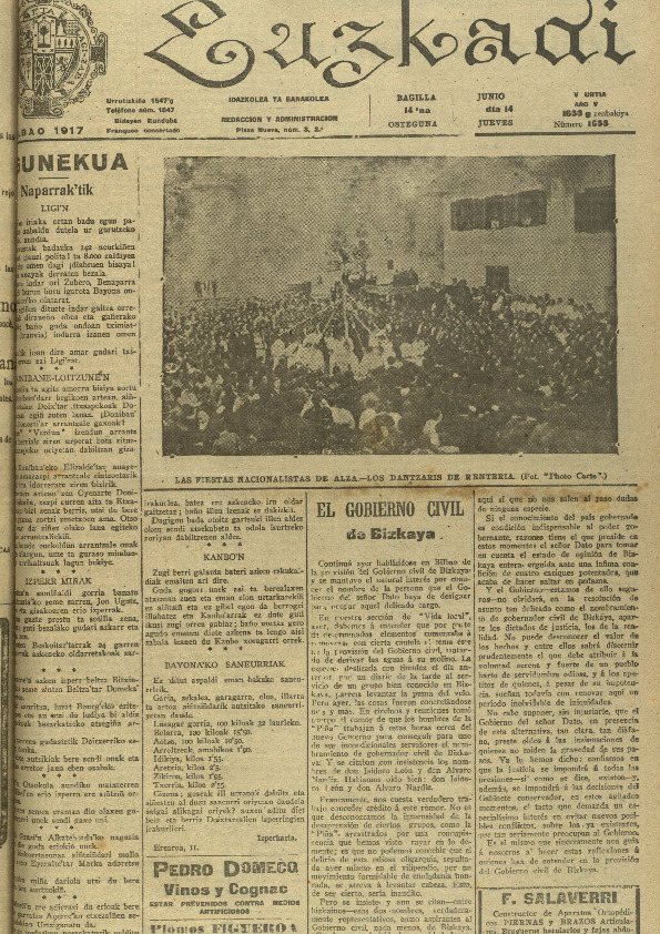 | Observaciones: | EAJ-PNV, Euzko Alderdi Jeltzalea - Partido Nacionalista Vasco. Pie de foto: "Las fiestas nacionalistas de Alza. Los dantzaris de Rentería (Fot. "Photo Carte")". Ver: ZABALETA, Mikel: El baluarte de J.E.L. Errenteria y el primer nacionalismo vasco (19... |