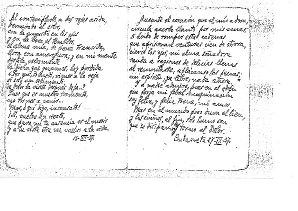 | Observaciones: | Literatura, poesia. Guerra Civil. Manuscritos. Siete poemas sueltos y dos poemas con varias estrofas: "¿Recuerdas?" y "Dolor de ausencia", todos escritos entre los días 7 de septiembre de 1937 y el 23 de enero de 1938 |