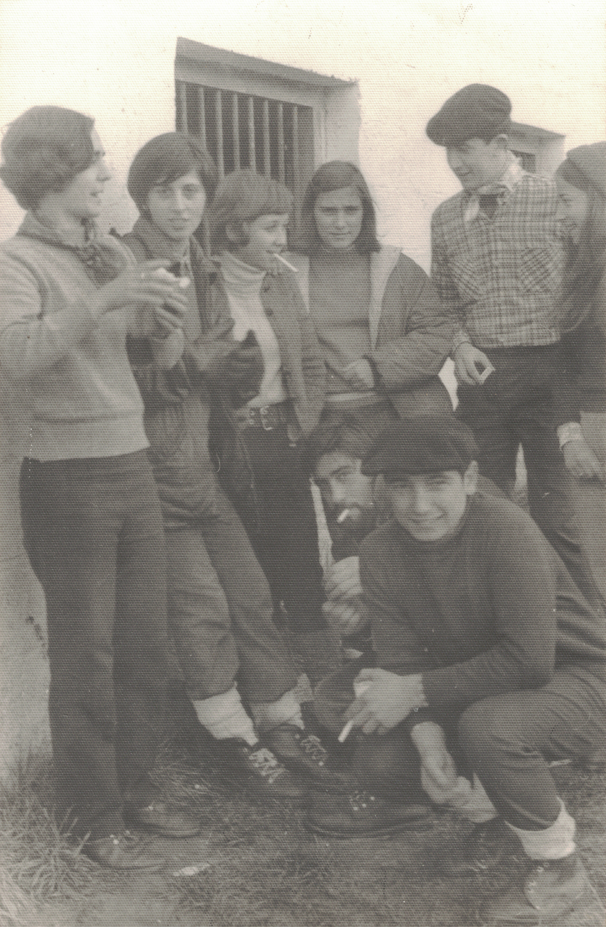 Oharrak: Zutik, ezkerretik eskuinera: Desi Barrado, Marga, M.ª Eugenia Simon, ¿?, Mauleon, ¿?. Makurtuta, ezkerretik eskuinera: Joaquín Íñigo "Txolo", Juan Andrés Vega. Gazte-Leku elkartea (Santa Barbara). Altzathlon, mendizaletasuna
