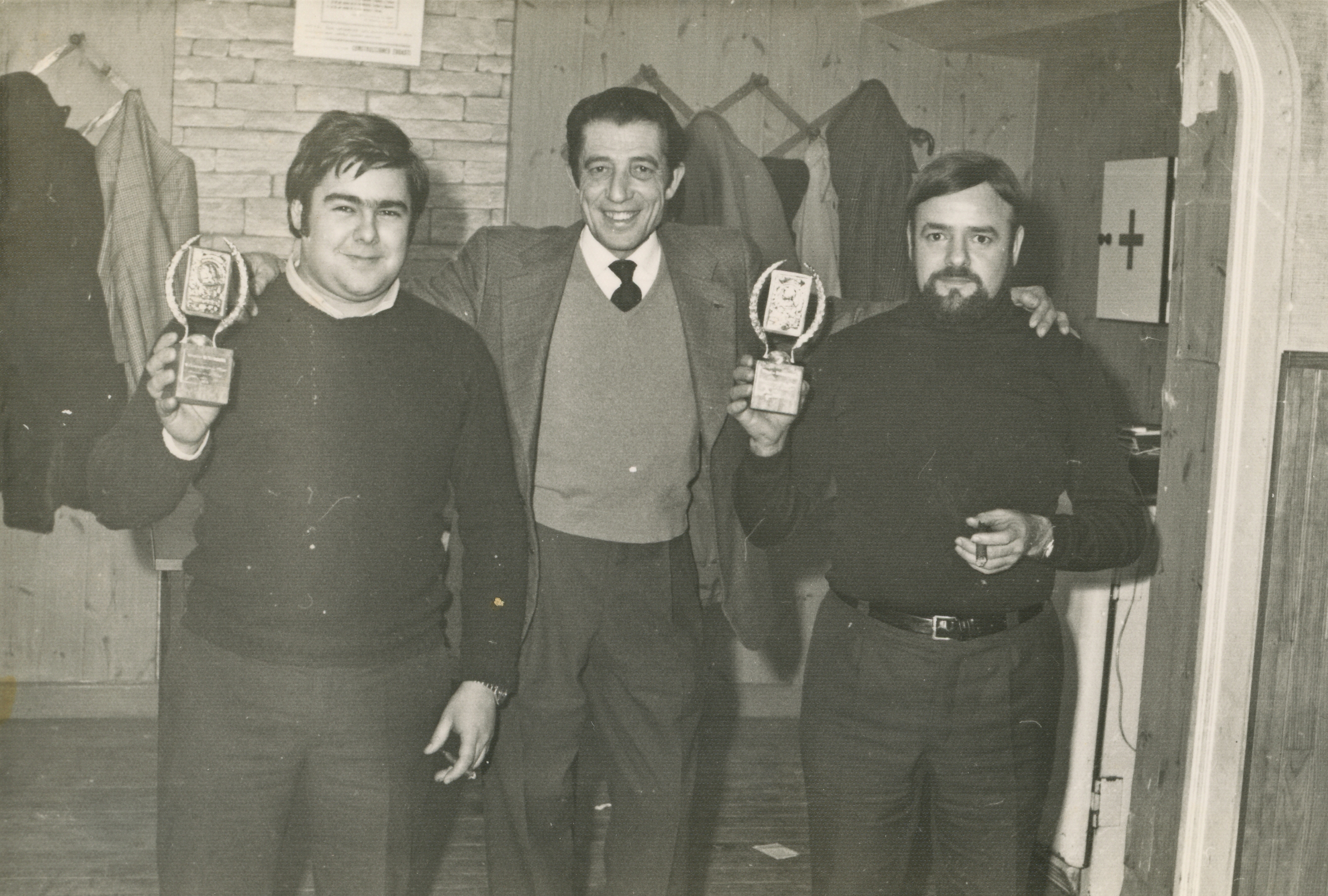 Ezaugarriak: Mus txapelketa "Cabezas de Familia" elkartean (Erroteta). Ariztegi anaiak, Juantxo (ezkerrean) eta Satur (eskuinean), elkarteko presidenteak emandako txapeldunen garaikurrak jasotzen