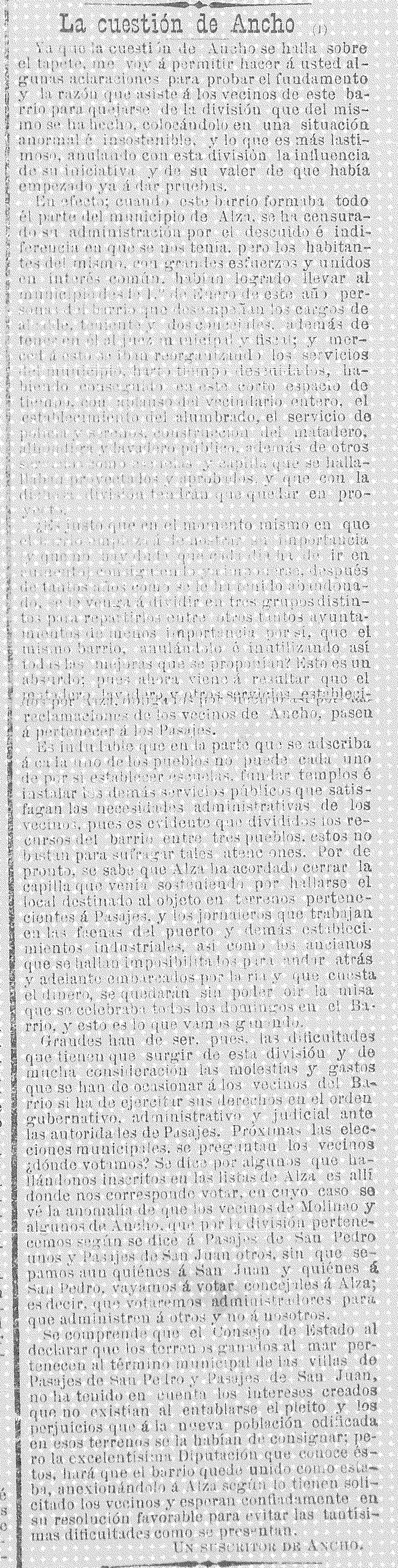 ¿Es justo que en el momento mismo en que el barrio empieza a demostrar su importancia y que no hay duda de que cada día ha de ir en aumento consiguiendo ya imponerse, después de tantos años como se ha tenido abandonado, se le venga a dividir en tres grupos distintos para repartirlos entre otros tantos ayuntamientos de menos importancia por sí que el mismo barrio, anulándolo e inutilizando así todas las mejoras que se proponían? Esto es un absurdo, pues ahora viene a resultar que el matadero, lavadero, y otros servicios establecidos por Alza, pongamos por decirlo así, por las reclamaciones de los vecinos de Ancho, pasan a pertenecer a los Pasajes.