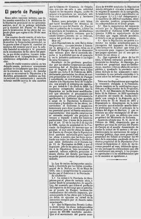 Como saben nuestros lectores, uno de los asuntos sometidos a la resolución de la Diputación provincial en las presentes sesiones, es el de la prórroga solicitada por la Sociedad del Puerto de Pasajes para la terminación de las obras del segundo plazo que expira el día 30 del mes de junio.