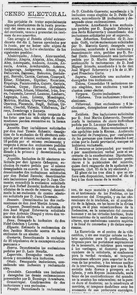 Azpeitia. Inclusión de 59 electores solicitada por don Ignacio Orbegozo; exclusión de cuatro pedida por el mismo denegándola en cuanto a los restantes; desestimadas dos inclusiones solicitadas por don Rafael Zuazola; desestimadas seis inclusiones pedidas por D. Juan Clemente; concedida la exclusión solicitada por Rafael Zuazola; inclusión de dos oficiales de la escala de reserva; desestimada la no exclusión de cuatro electores solicitada por D. Juan Clemente.