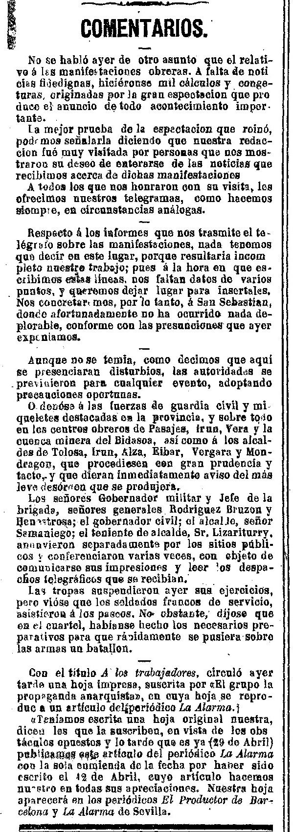 Ordenóse a las fuerzas de la guardia civil y miqueletes destacados en la provincia, y sobre todo en los centros obreros de Pasajes, Irún, Vera y la cuenca minera del Bidasoa, así como a los alcaldes de Tolosa, Irún, Alza, Eibar, Vergara y Mondragón, que procediesen con gran prudencia y tacto y que dieran inmediatamente aviso del más leve desorden que se produjera.