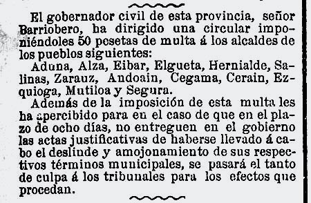 Además de la imposición de esta multa les ha apercibido para en el caso de que en el plazo de ocho días, no entreguen en el gobierno las actas justificativas de haberse llevado a cabo el deslinde y amojonamiento de sus respectivos términos municipales, se pasará el tanto de culpa a los tribunales para los efectos que procedan.