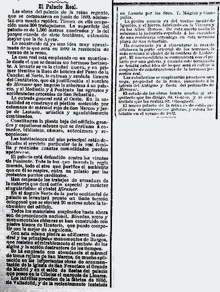 Las obras del palacio de la reina regente, que se comenzaron en junio de 1889, adelantan con mucha rapidez. Tienen en ella ocupación unos 300 trabajadores. La superficie del palacio es de 1.500 metros cuadrados y la del parque excede de siete hectáreas, extensión mayor que la de Ayete.