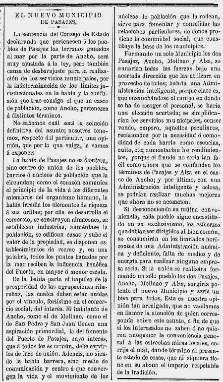 Si desconociendo su mutua conveniencia, cada pueblo sigue encastillado en su exclusivismo, los esfuerzos que debían ser dirigidos al bien común, se consumirán en los limitados horizontes de una Administración anémica y deficiente, falta de medios y de energía para realizar ninguna empresa seria. Si la unión se realizara formando un solo pueblo los dos Pasajes, Ancho, Molinao y Alza, surgiría potente el nuevo municipio y sería un bien para todos. Ésta es nuestra opinión tan arraigada, que no vacilamos en llamar la atención de quien corresponda sobre este asunto, a fin de que si los interesados no saben o no quieren anteponer la conveniencia general a las estrechas miras locales, corrija el mal dando término al presente estado de cosas, que ni siquiera tiene en su abono el imperio respetable de la tradición.