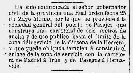Ha sido comunicada al señor gobernador civil de la provincia una Real orden fecha 25 de mayo último, por la que se previene a la sociedad general del Puerto de Pasajes que construya una carretera de seis metros de ancha y de uso público hasta el límite de la zona del servicio de la dársena de La Herrera, y que quede obligada también a construir el enlace de la zona de servicio con la carretera de Madrid a Irún y de Pasajes a Hernavide.