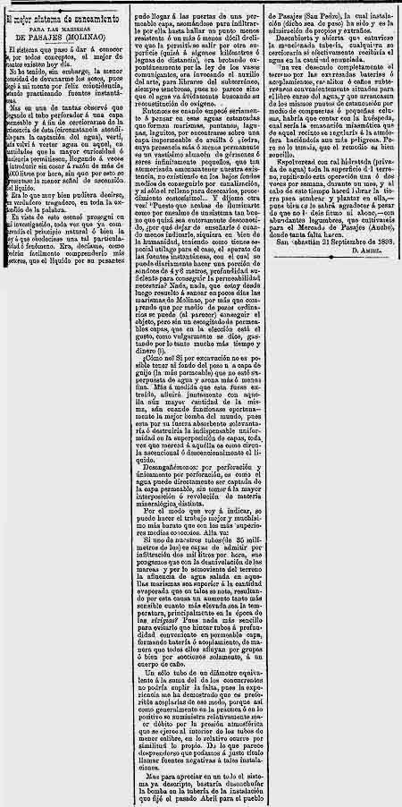 Entonces es cuando empecé seriamente a pensar en esas aguas estancadas que forman marismas, pantanos, lagunas, laguitos, por encontrarse sobre una capa impermeable de arcilla o piedra, cuya presencia más o menos permanente es un vastísimo almacén de gérmenes o seres infinitivamente pequeños, que tan atemorizada amenaza tener nuestra existencia, no existiendo en los bajos fondos medios de conseguirlo por canalización, y si sólo el relleno para desecarlos, procedimiento costosísimo… Y díjeme otra vez: “Puesto que acabas de iluminarte como por ensalmo de un sistema tan bueno que quizá sea enteramente desconocido, ¿Por qué dejar de enseñarle o cuando menos indicarle, siquiera en bien de la humanidad, teniendo como tienes especial utillaje para el caso, el aparato de las fuentes instantáneas, con el cual se puede diariamente hacer una porción de sondeos de 4 y 6 metros, profundidad suficiente para conseguir la permeabilidad necesaria? Nada, nada, que estoy desde luego resuelto a sanear en pocos días las marismas de Molinao, por más que comprendo que por medio de pozos ordinarios se puede (al parecer) conseguir el objeto, pero sin un excogitado de permeables capas, que en la elección está el gusto, como vulgarmente se dice, gastando por lo tanto mucho más tiempo y dinero (l).