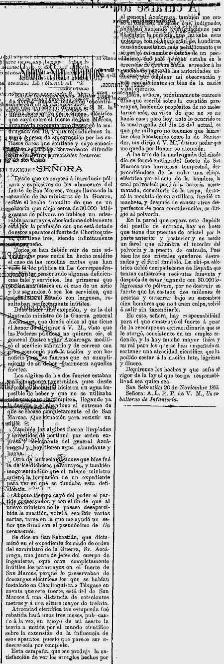 Se dice en San Sebastián, que dictaminó en el expediente formado de orden del ex ministro de la Guerra, Sr. Azcárraga, una junta de jefes del cuerpo de ingenieros, que eran completamente inútiles los pararrayos en el fuerte de San Marcos, porque lo preservaban de descargas eléctricas los que se habían instalado en Choritoquieta. Téngase en cuenta que este fuerte, está del de San Marcos a una distancia de setecientos metros y a una altura mayor de treinta.