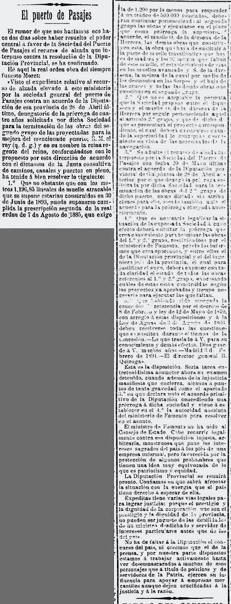 El rumor de que nos hacíamos eco hace dos días sobre haber resuelto el poder central a favor de la Sociedad del Puerto de Pasajes el recurso de alzada que interpuso contra la resolución de la Diputación Provincial, se ha confirmado.