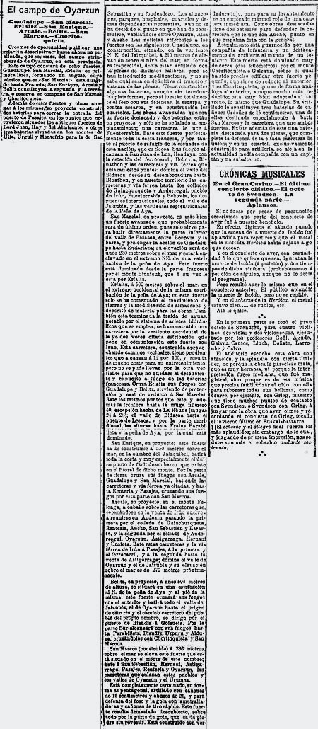 Además de estos fuertes y obras anexas a los mismos, “se proyecta construir dos baterías para cerrar la entrada del puerto de Pasajes, en los puntos que estuvieron situados los antiguos fuertes de Lord Jhon, Hay y del Almirante, y otras tres baterías situadas en los montes de Ulía, Urgull y Montefrío para la de San Sebastián y su fondeadero. Los almacenes, parques, hospitales, cuarteles y demás dependencias necesarias, aún no se ha decidido el punto en que han de construirse, vacilándose entre Oyarzun, Alza y Ancho. Las noticias referentes a los fuertes son la siguientes: Guadalupe, en construcción, situado, en la vertiente N. E. del Jaizquíbel, a 210 metros de elevación sobre el nivel del mar; su forma es trapezoidal, debía estar artillado con 72 piezas de distintos calibres, pero se han introducido modificaciones, y no se sabe cuál será en definitiva el número y sistema de las piezas. Tiene construidas algunas baterías, aunque sin terminar las plataformas, pero sí lo están totalmente el foso con sus defensas, la escarpa y contra escarpa, y en construcción los cuarteles. Las obras avanzadas que son un fuerte destacado y dos baterías, están en proyecto, y sólo se ha señalado su emplazamiento; una carretera le une a Fuenterrabía. Bate este fuerte perfectamente toda la costa francesa, y por tanto el puerto de refugio de la escuadra de esta nación, que es Socoa. Sus fuegos alcanzan a San Juan de Luz, Hendaya, con la estación del ferrocarril, Behovia, Binathon y las carreteras y vía férrea que enlazan estos puntos; domina el valle del Bidasoa, desde su desembocadura hasta Binathon, y en nuestro territorio las carreteras y vía férrea hasta los collados de Gainchurizqueta y Andorregui, pueblo de Irún, Fuenterrabía y Behovia, los dos puentes internacionales, todo el valle de Jaizubia, y las vertientes septentrionales de la Peña de Aya.