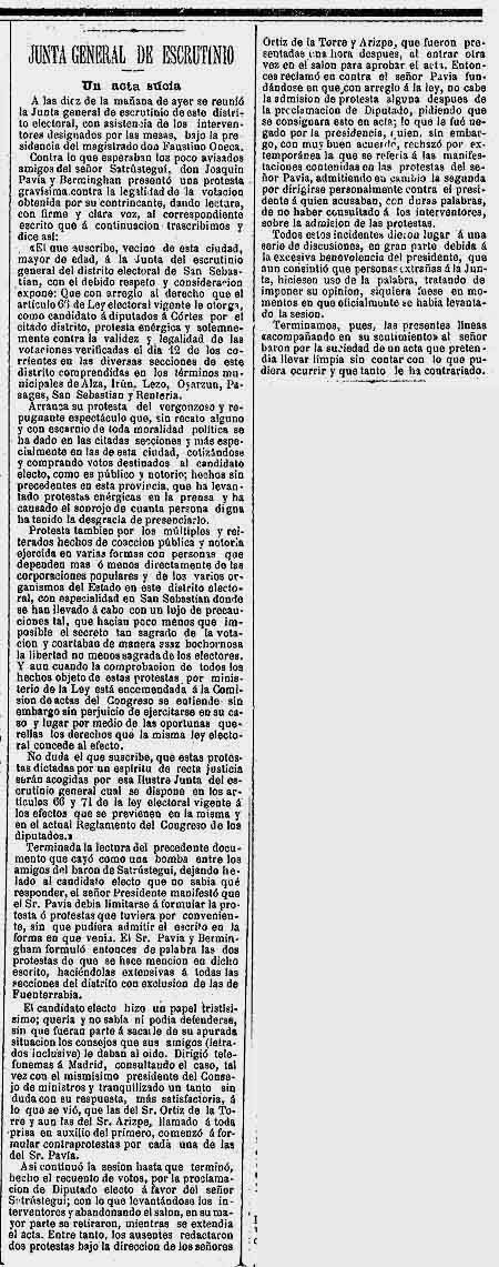 “El que suscribe, vecino de esta ciudad, mayor de edad, a la Junta del escrutinio general del distrito electoral de San Sebastián, con el debido respeto y consideración expone: Que con arreglo al derecho que el artículo 68 de la ley electoral vigente le otorga, como candidato a diputados a Cortes por el citado distrito, protesta enérgica y solemnemente contra la validez y legalidad de las votaciones verificadas el día 12 de los corrientes en las diversas secciones de este distrito comprendidas en los términos municipales de Alza, Irún, Lezo, Oyarzun, Pasajes, San Sebastián y Rentería.