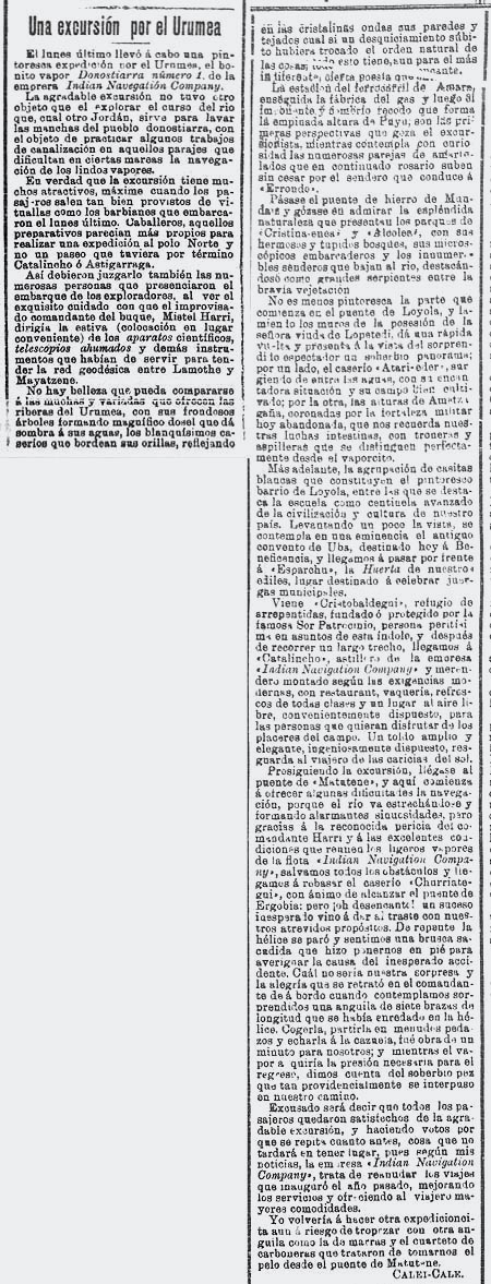 No hay belleza que pueda compararse a las muchas y variadas que ofrecen las riberas del Urumea, con sus frondosos árboles formando magnífico dosel que da sombra a sus aguas, los blanquísimos caseríos que bordean sus orillas, reflejando en las cristalinas ondas sus paredes y tejados cual si un desquiciamiento súbito hubiera trocado el orden natural de las cosas; todo esto tiene, aun para el más indiferente, cierta poesía que encante.