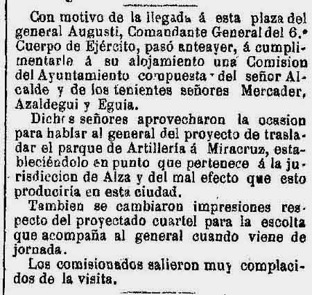 Dichos señores aprovecharon la ocasión para hablar al general del proyecto de trasladar el parque de Artillería a Miracruz, estableciéndolo en punto que pertenece a la jurisdicción de Alza y del mal efecto que esto produciría en esta ciudad.