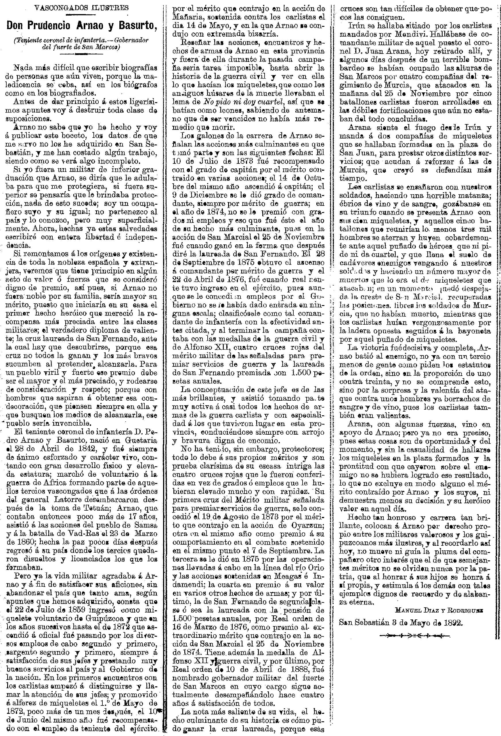 Hecho tan honroso y carrera tan brillante, colocan a Arnao pro derecho propio entre los militares valerosos y los guipuzcoanos más ilustres, y al recordarlo así hoy, no mueve mi guía la pluma del compañero otro interés que el de que semejantes méritos no se olviden nunca por la patria, que al honrar a sus hijos se honra a sí propia, y estimula a los demás con tales ejemplos dignos de recuerdo y de alabanza eterna.
