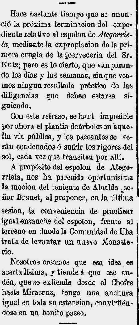 Hace bastante tiempo que se anunció la próxima terminación del expediente relativo al espolón de Ategorrieta, mediante la expropiación de la primera crujía de la cervecería del Sr. Kutz; pero es lo cierto, que van pasando los días y las semanas, sin que veamos ningún resultado práctico de las diligencias que deben estarse siguiendo.
