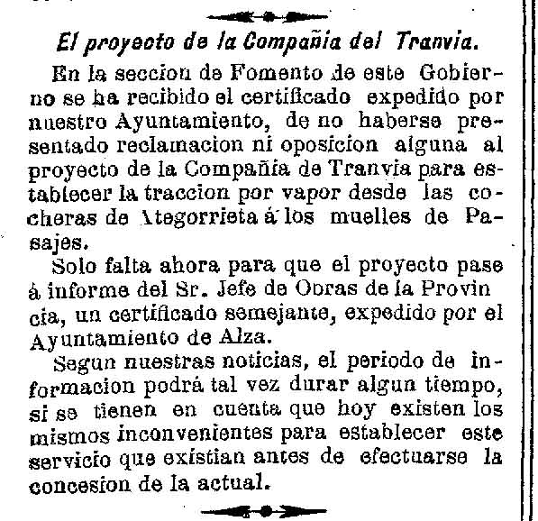 En la sección de Fomento de este Gobierno se ha recibido el certificado expedido por nuestro Ayuntamiento, de no haberse presentado reclamación ni oposición alguna al proyecto de la Compañía del Tranvía para establecer la tracción por vapor desde las cocheras de Ategorrieta a los muelles de Pasajes.