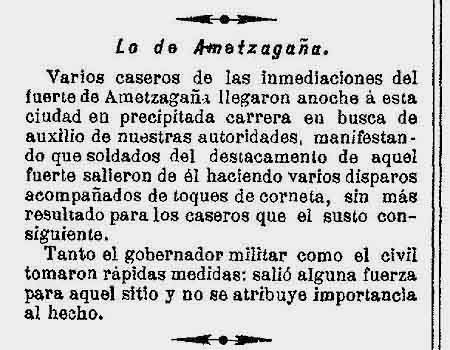 Varios caseros de las inmediaciones del fuerte de Ametzagaña llegaron anoche a esta ciudad en precipitada carrera en busca de auxilio de nuestras autoridades, manifestando que soldados del destacamento de aquel fuerte salieron de él haciendo varios disparos acompañados de toques de corneta, sin más resultado para los caseros que el susto consiguiente.