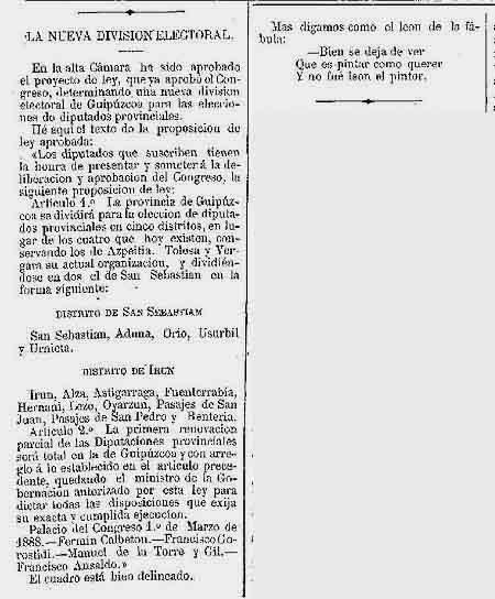 En la alta Cámara ha sido aprobado el proyecto de ley que ya aprobó el Congreso, determinando una nueva división electoral de Guipúzcoa para las elecciones de diputados provinciales.