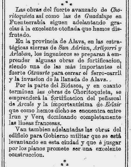 Las obras del fuerte avanzado de Choritoquieta así como las de Guadalupe en Fuenterrabía figuren adelantando gracias a la excelente otoñada que hemos disfrutado.