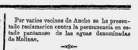 Por varios vecinos de Ancho se ha presentado reclamación contra la permanencia en estado pantanoso de las aguas denominadas de Molinao.