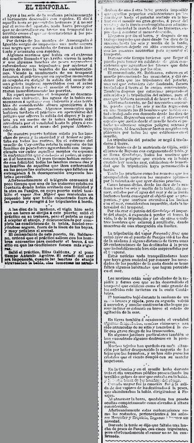 Salió el práctico, Elías Galduna, y al poco tiempo Antonio Aguirre. EL estado del mar era imponente, cuando las lanchas de atuaje atravesaban la bahía, olas inmensas las zarandeaban de uno a otro lado; parecía imposible que aquellas pequeñas embarcaciones pudieran llegar hasta el patache anclado en la bahía; en el muelle un gran gentío, a pesar del viento y de la lluvia contemplaba con admiración y ansiedad la marcha de las traineras, expuestas a zozobrar al menor descuido.