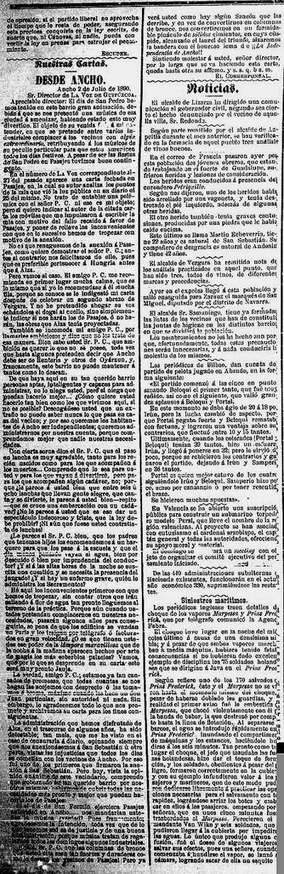 El día de San Pedro hemos tenido en este barrio gran animación, debido a que se nos presentó una música de esa ciudad a amenizar, habiendo estado esto muy divertido. El objeto de su venida fue, a mi entender, en que se pretende entre varios industriales complacer a los vecinos con algún extraordinario, retribuyendo a los músicos de su peculio particular para que éstos amenicen todos los días festivos. A pesar de ser las fiestas de San Pedro, en Pasajes tuvimos buen contingente.