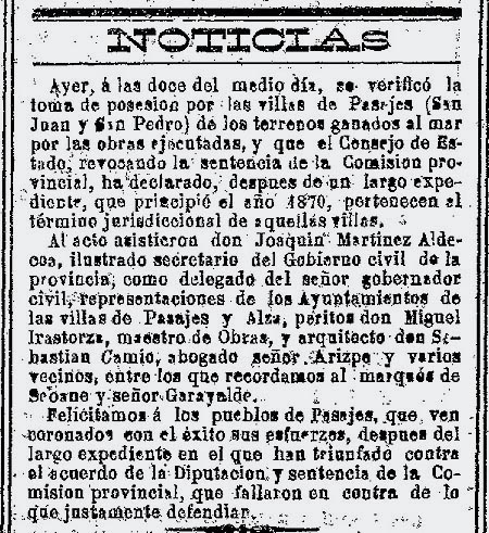 Ayer, a las doce del mediodía, se verificó la toma de posesión por las villas de Pasajes (San Juan y San Pedro) de los terrenos ganados al mar por las obras ejecutadas, y que el Consejo de Estado, revocando la sentencia de la Comisión Provincial, ha declarado, después de un largo expediente, que principió el año 1870, pertenecen al término jurisdiccional de aquella villa.
